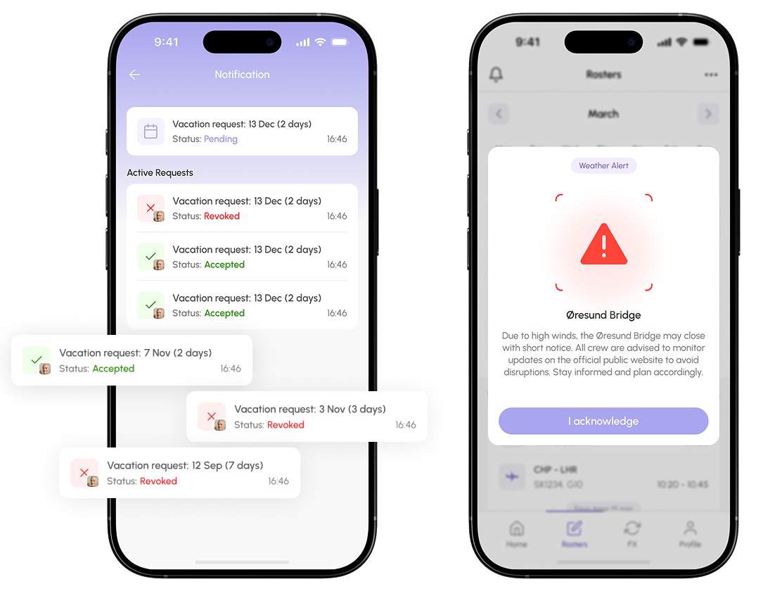 The mobile app provides crew members with instant notifications about flight updates, tasks, and schedule changes. Built-in chat ensures seamless communication between team members — whether on the ground or in the air.